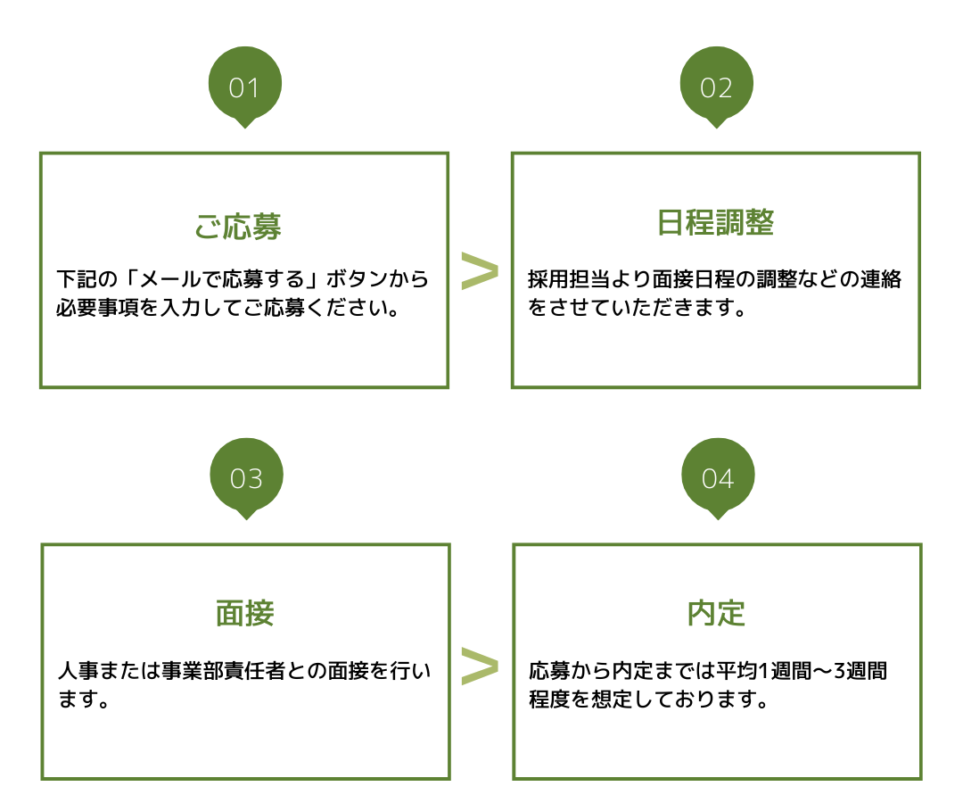 01 ご応募 下記の「メールで応募する」ボタンから必要事項を入力してご応募ください。 02 日程調整 採用担当より面接日程の調整などの連絡をさせていただきます。 03 面接 人事または事業部責任者との面接を行います。 04 内定 応募から内定までは平均1週間~3週間程度を想定しております。 応募 下記の「メールで応募する」をクリックし、必要事項をご記入ください。※原則メールでの応募といたします。メールが使用できない等ある場合は、下記の電話番号にご連絡ください。 メールで応募する hotomekikaigo@outlook.jp へメールを送信 ※ メーラーが起動します TEL:092-707-7938 お電話から応募する 合同会社大王薬樹 TEL:092-707-7938 〒814-0022 福岡市早良区原1丁目35番9号 アイリス原105 お問い合わせはコチラから